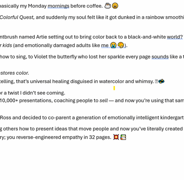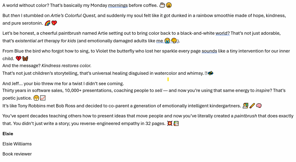 Full of heart, hope, and imagination, Artie’s Colorful Quest celebrates the magic of creativity and the joy of helping others. Perfect for bedtime reading or classroom story time, this charming tale will leave young readers inspired to find their own color within.